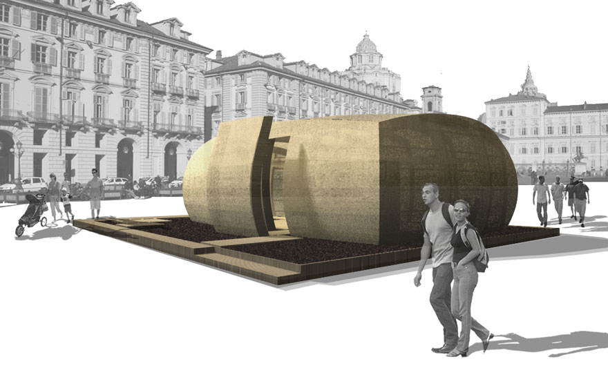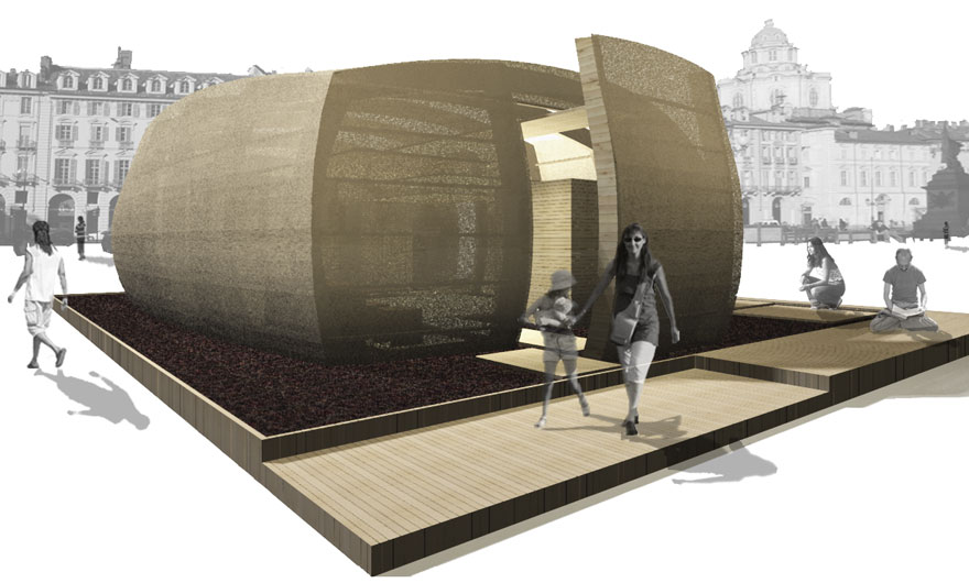 The communication, ever been concrete and tangible, is transforming involved in the frenetic evolution of our century. With the overbearing coming of the mass media, and more over with internet and the cellular phone, the communication is turning into something ephemeral, fleeting and impalpable. The pavilion wants to conciliate the real and physics communication with the ephemeral one, offering spaces where people can socialize. Materials and forms work in conjunction to find a meeting between the two: the salix-willow panels with the smooth and floating shape create a perfect covering to a solid material as wood that becomes structure and surface on which it s possible to walk on. The equipped internal space is directly involved in the city, but shielded by a filter , the willow covering, that protect from the sunbeam, but at the same time leaves light and air to seep through. The two splits in the covering give the access to this intimate place, enjoyable at every hour of the day and of the night...